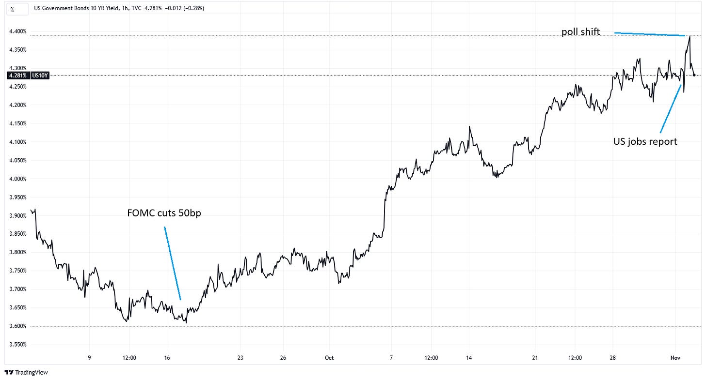 On the one hand, bond yields are projecting well beyond this week. They took one look at the outsized US rate cut in September and started climbing, essentially saying that politics was likely to bring inflation back and getting so far ahead in rate cuts was depleting the arsenal that just might be needed. The 10-year yield is betting that the Fed will not be able to cut rates as much as was initially hoped, and that overall macro uncertainty deserves a higher risk premium. Even the bad US jobs report on Friday (more on this below) produced only a brief hiccup.