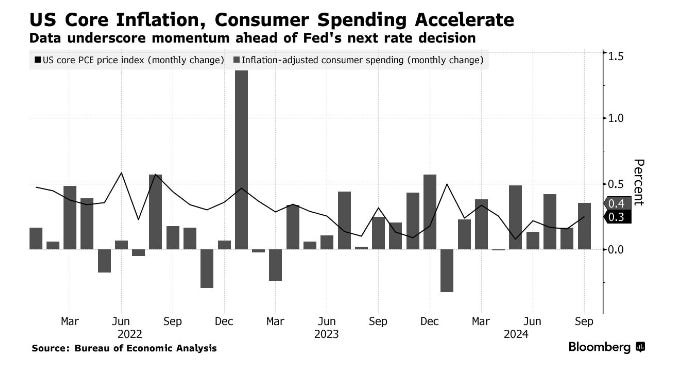 Moving on to inflation, there are signs of stickiness. The latest Personal Consumption Expenditure release for September, released last Thursday, showed an acceleration in month-on-month growth in the headline index, from 0.1% to 0.2%. The more significant core index growth accelerated from 0.2% to 0.3%, the highest rate since April, keeping the year-on-year growth flat at 2.7%.