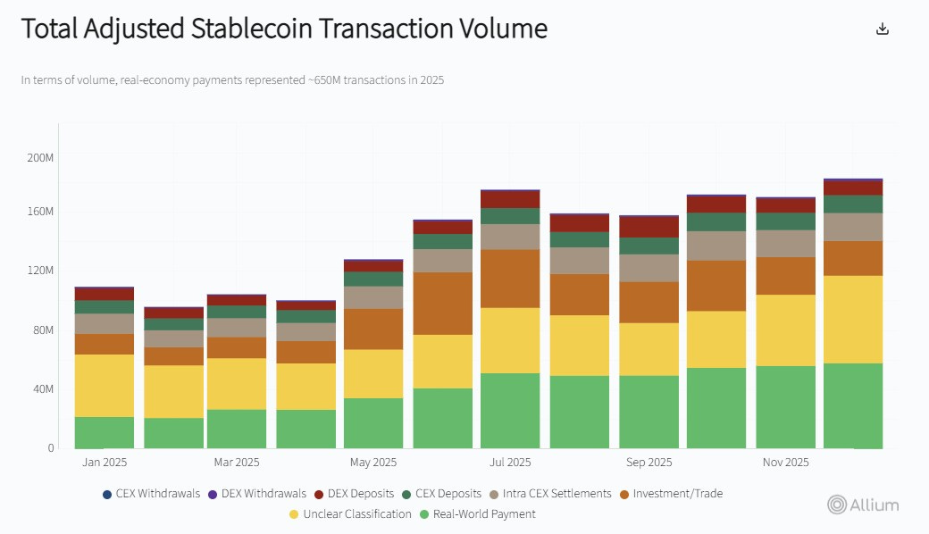 For instance, the below chart – stripped of “noise” – shows that the monthly number of real-world payment transactions using stablecoins more than doubled from January to December last year.