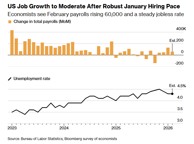 On Friday, we get the US jobs report for February, with the increase in payrolls expected to drop to 60,000 from January’s 130,000 (which will probably get revised down). The unemployment rate is forecast to hold steady at 4.3%.