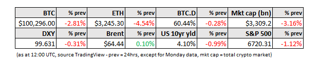Crypto markets are not in a good mood, with BTC yet again testing $100,000.