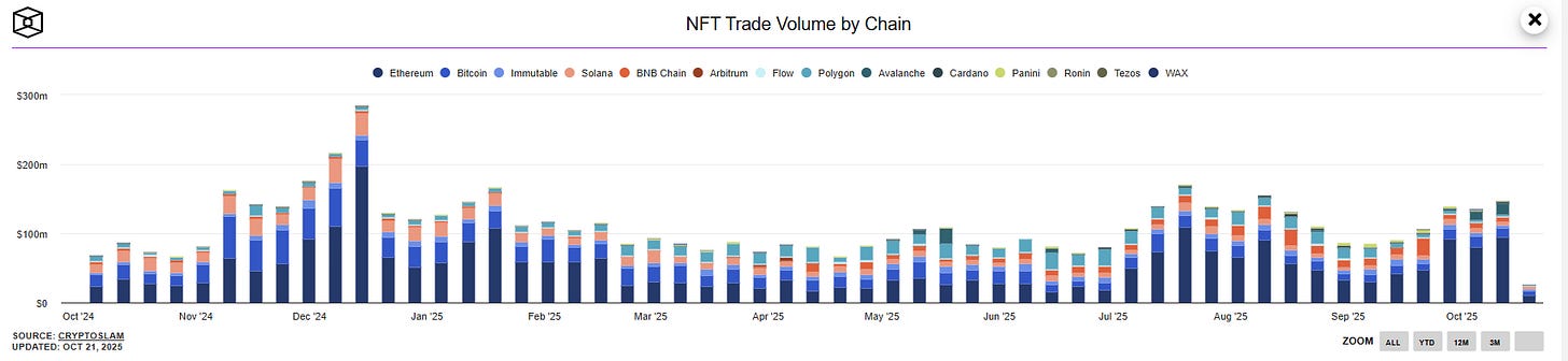 But data doesn’t back that up. According to CryptoSlam, monthly sales are over $500 million, well below the $3-5 billion seen in the 2021-22 heyday, but not nothing.