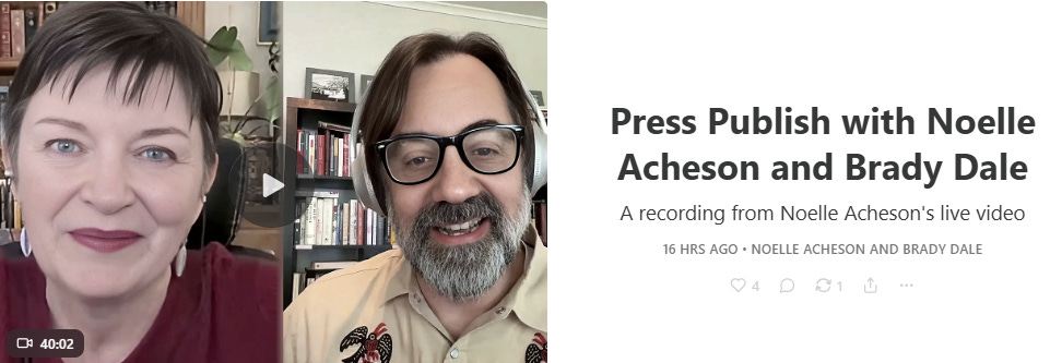 And if you missed my Substack Live “Press Publish” session with Brady Dale yesterday, where we talked about media, newslettering, Substack, platforms in general, and a whole lot more, you can catch the replay here.
