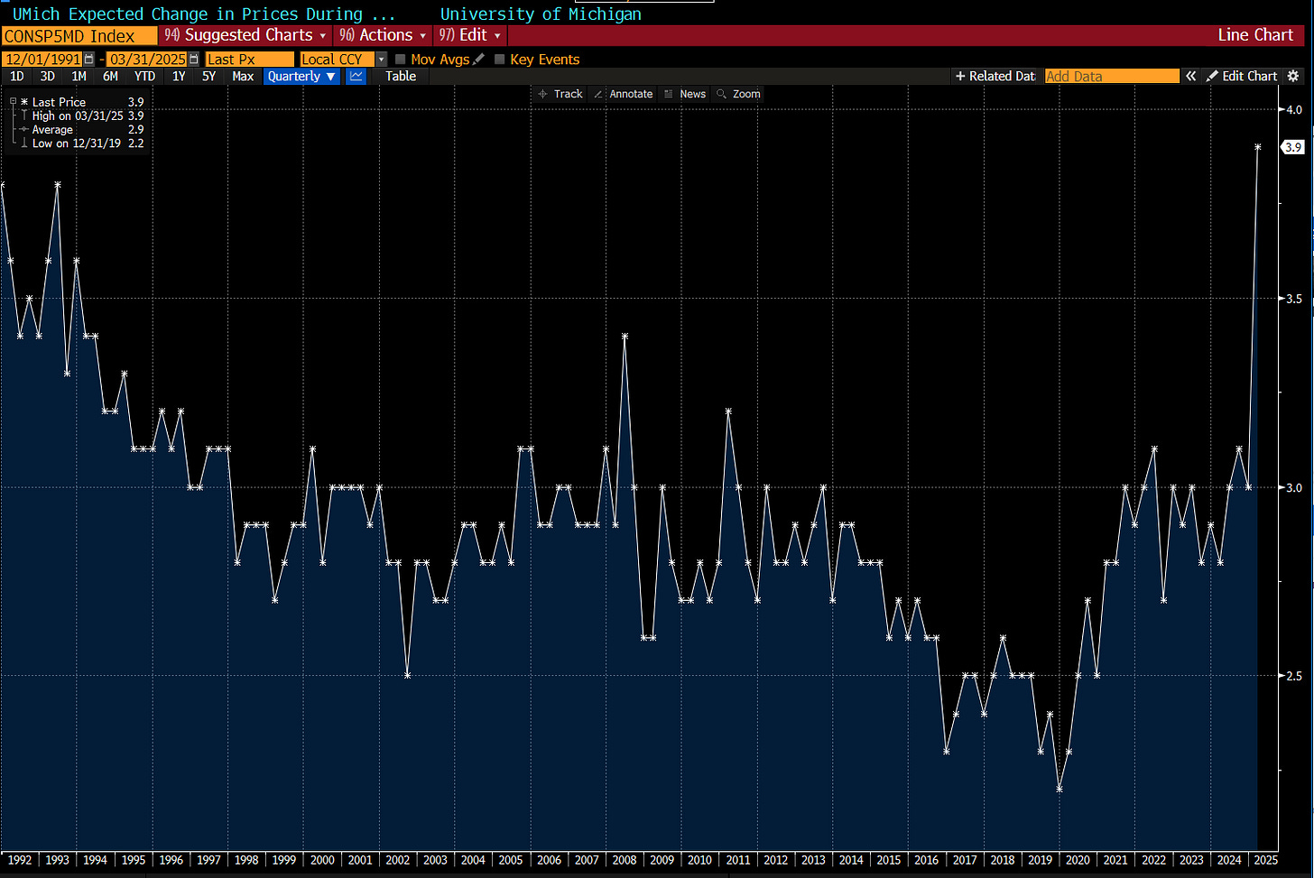 And we get the final University of Michigan consumer survey report for March, which will either confirm or adjust the startling increase in inflation expectations reported a couple of weeks ago – long-term inflation expectations jumped from 3.4% to 3.9%, the highest level recorded by the survey since at least the early 1990s.