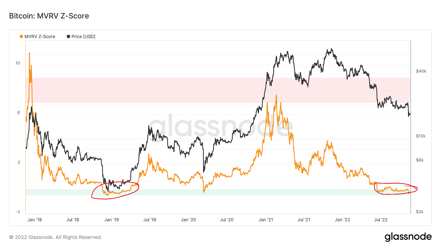 The MVRV Z-score, which detects momentum shifts in the difference between BTC’s market value and the average acquisition cost, has already lasted longer in the “green zone” (value < 1.0, signalling undervaluation) than the 2018 bear market, although only by a couple of weeks.