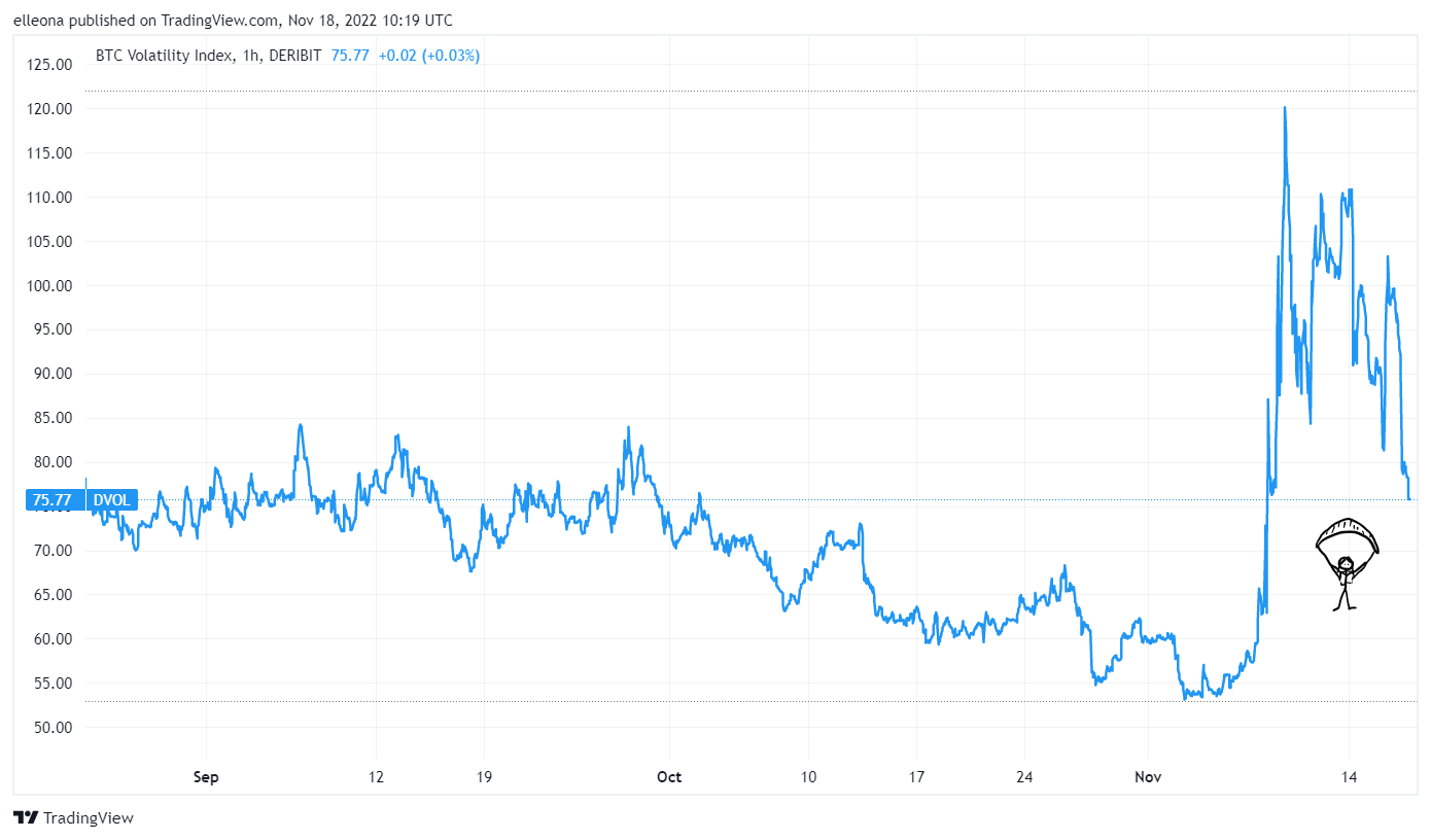 Some data points are pointing to a generalized “meh”, which is necessary to consolidate a floor. The DVOL index, which tracks BTC’s implied volatility, understandably shot up from unusually low levels, but has since drifted lower into September’s range.
