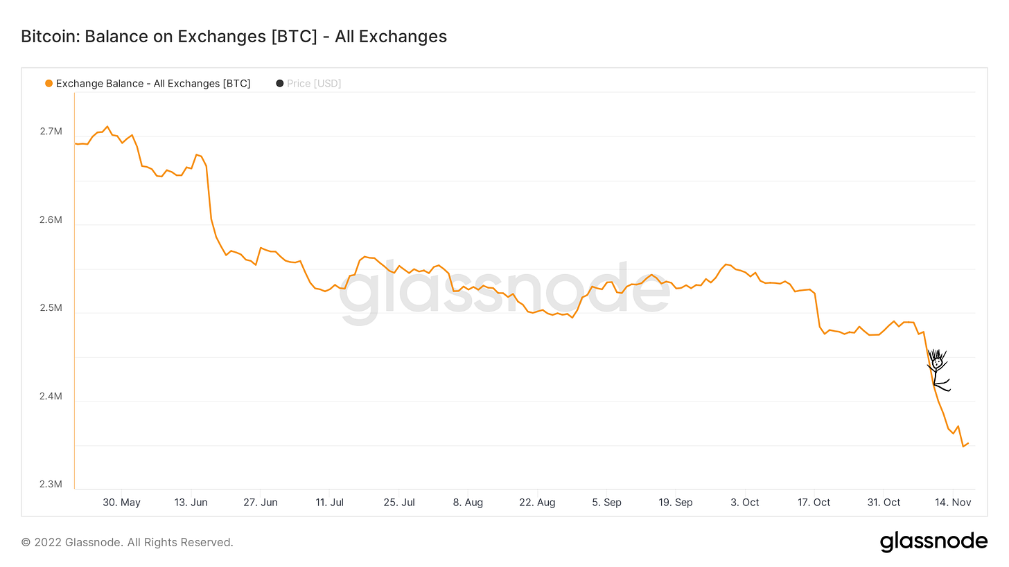 And while some long-term holdings are moving, holding behaviour is still strong. A record 67% of BTC has not moved in over a year. And the outflow of BTC from exchanges hints at further determination to hold as users move to self-custody. This metric can be misleading as not all exchange addresses are correctly labelled, and some BTC could be going to decentralized exchanges for trading – but the trend here is unusually clear