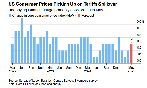 Wednesday brings the big economic event of the week: US inflation for May, with the consensus estimate pointing to a slight acceleration. Headline CPI is expected to have increased by 2.5% vs 2.3% in April, and core inflation is expected to accelerate to 2.9% from 2.8%.
