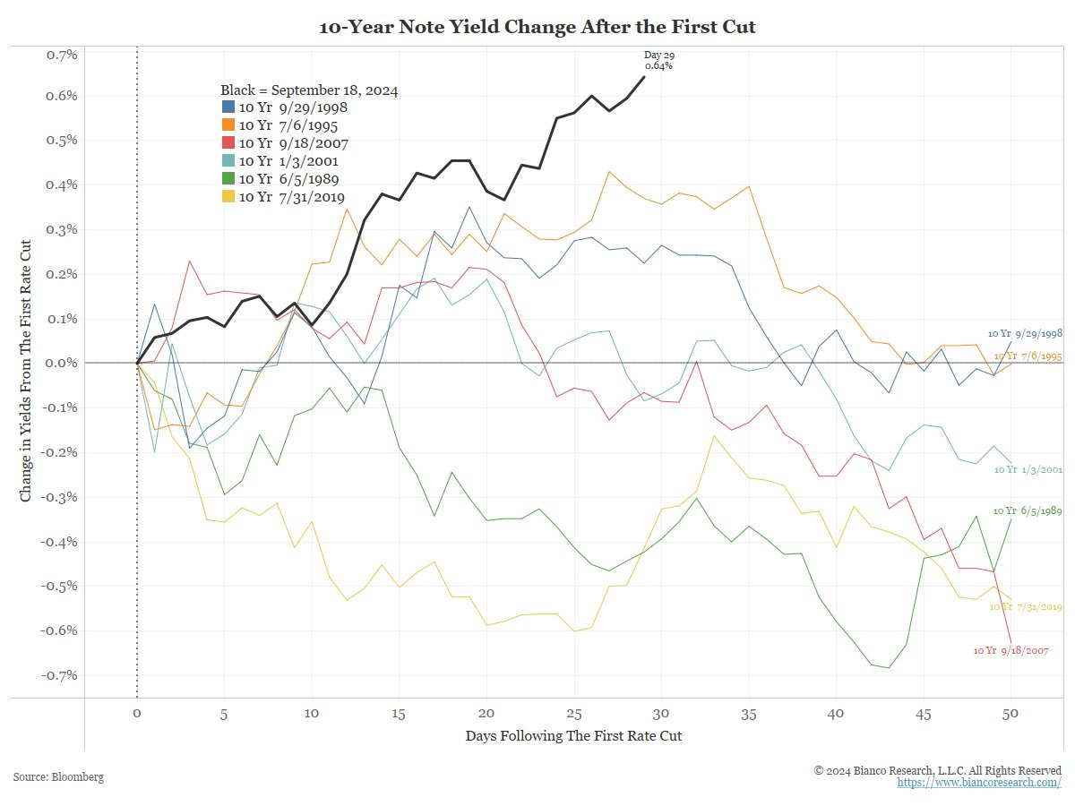 Here’s a good chart from Bianco Research that shows the recent US treasury yield climb in the context of previous easing cycles. It’s the steepest since 1989.