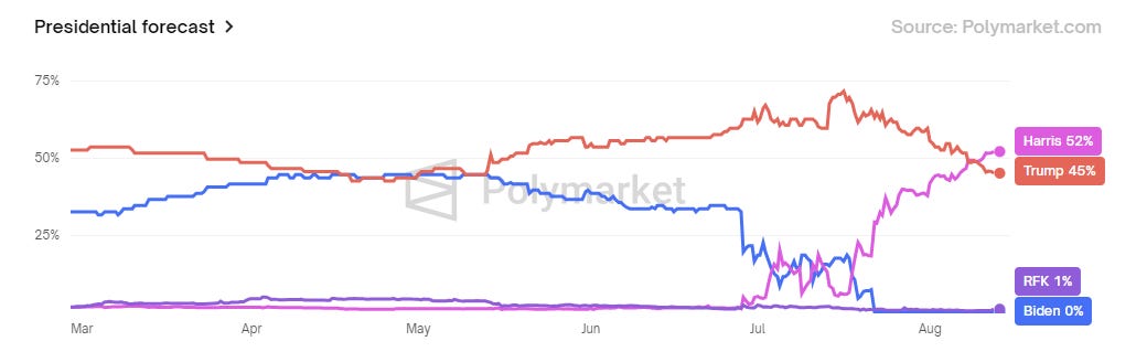 Perhaps what we’re seeing is crypto investor disappointment. Although, rather than disappointment, I think what we’re seeing is the uncomfortable return of uncertainty. A strong likelihood of a Trump victory would have been good for the crypto ecosystem in the US. That likelihood is no longer strong. Of course, it’s early days yet and polls will fluctuate over the next three months. But the mood has shifted, and judging from what seem like increasingly shrill posts on X, public crypto figures who have gone all-in on Trump are getting rattled.