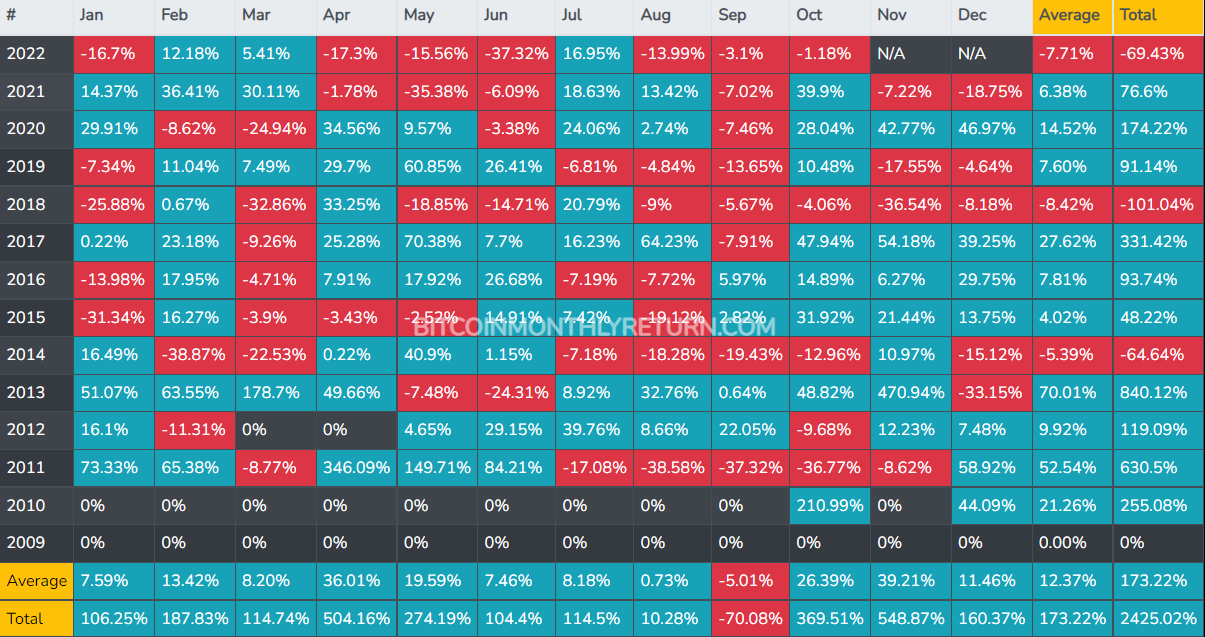Back to BTC, which fell just over 3% in September, a relatively robust performance for a usually negative month – September has been red for the asset more times than any other month, and the few times it has been positive, returns have been meagre.