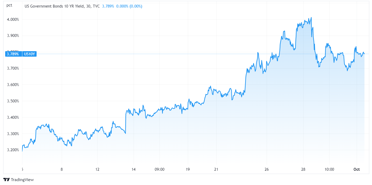 After some volatile moves that pushed it briefly above 4%, the US 10-year yield is now holding just under 3.8%.