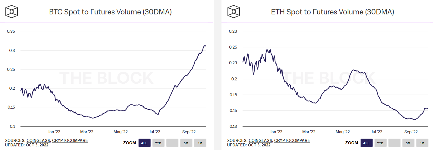 Nevertheless, data is gently suggesting that interest in BTC is picking up. Last week we looked at the increase in spot volumes compared to those of ETH. Zooming out to early summer, we can see that accumulation (reflected in spot volumes) has been more of a market driver than speculation (reflected in futures volumes, obviously with caveats) for BTC – not so much for ETH.