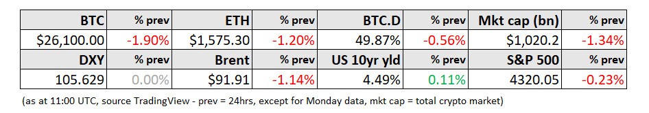 In crypto markets, investor attention is more focused on macro liquidity indicators (not looking good) than on the potential for a bitcoin spot ETF approval. Although Bloomberg analysts place the probability of approval at 75% before the end of 2023, 95% before the end of 2024, this is not priced in, which shows how macro concerns still prevail.