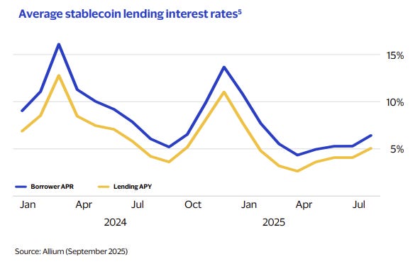 (NOTE: Allium are sponsors of this newsletter – they didn’t ask me to feature the report, I’m doing so because I genuinely found it a welcome change from the usual stablecoin narratives. They share data I haven’t seen elsewhere, such as detailed breakdowns of stablecoin lending by token and chain. Check it out if you’re interested in more detail.)
