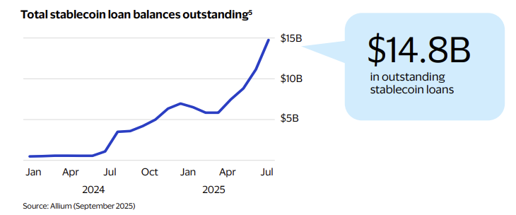 The amount of stablecoin loans outstanding has soared in recent months to $14.8 billion.