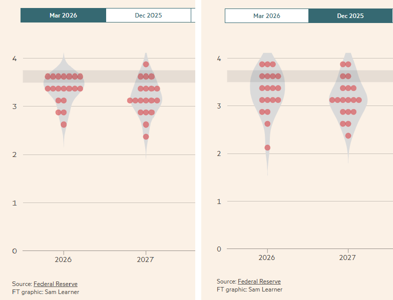 Yet the average expectation for the fed funds rate at the end of 2026 did not change, signalling only one cut this year and one next year, far from the drastic easing favoured by President Trump and Fed Governor Stephen Miran. The distribution of expectations did change, however – even the most dovish call, presumably from Miran, was raised. The number of FOMC members forecasting more than two cuts for the remainder of this year has gone from eight in December to just five.