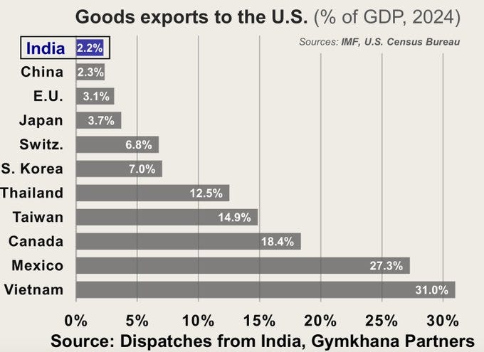 This could go on for a while. Some reports suggest that, while the economic hit to India is real, it’s not insurmountable as Indian exports to the US are only around 2.2% of total GDP.