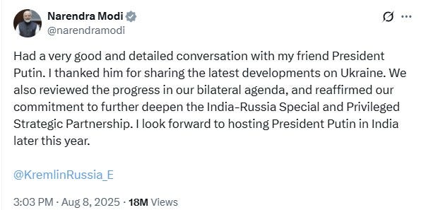 Like others, Modi is not just betting on the Trump Always Chickens Out (TACO) trade. When it comes to India, he probably will – but trust, once broken, is hard to replace. If you were Vladimir Putin or Xi Jinping, you’d take this as a huge win. The connections and incentives being redrawn will last a lot longer than Trump, and it’s not clear the Administration realizes how this weakens the US global position longer term.