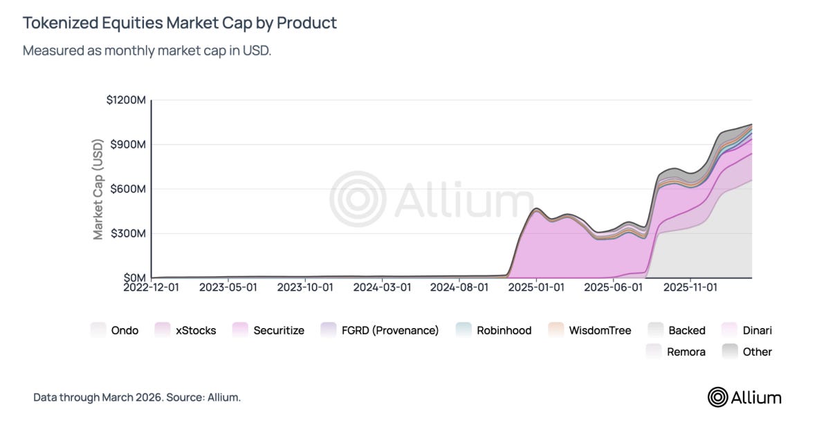 Tokenized equities hit ~$1B in supply since launching in mid 2025. The market structure is more interesting than the milestone.