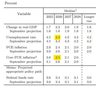 In the statement and the economic projections, the impact of tariffs was nowhere to be seen. The updated economic projections bumped expected GDP growth for 2026 from 1.8% to 2.3% (vs 1.7% expected for 2025); the core PCE inflation forecast came down slightly from 2.6% to 2.5% (vs 3.0% expected for end 2025); and unemployment held steady at 4.4%.