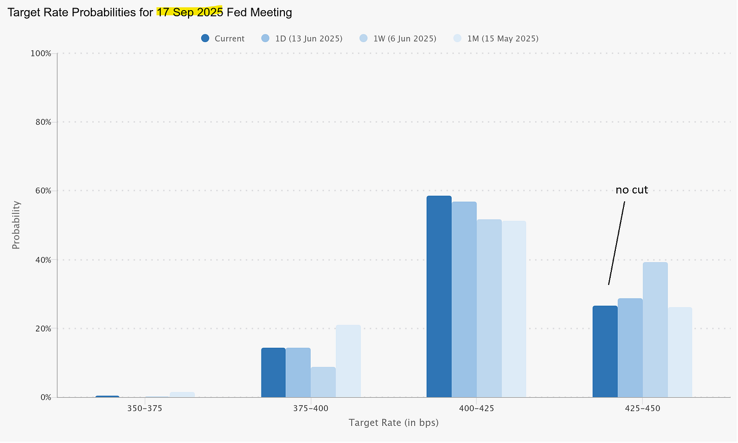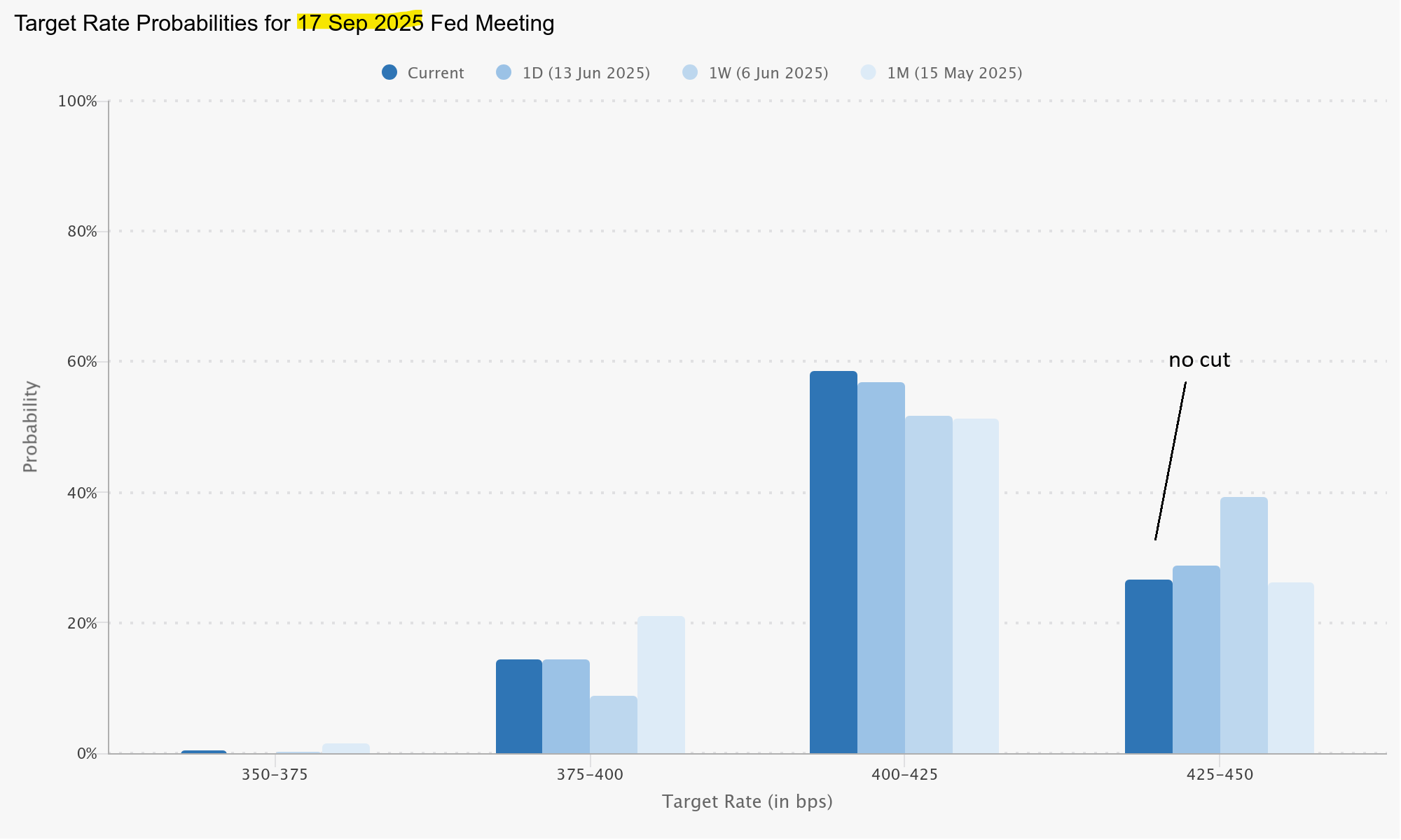 Plus, Chair Powell stressed at the last FOMC press conference in May that the risks of higher inflation had risen, so we could see an upward adjustment to the end-of-year expectation which would push back even further market expectations of a rate cut – as it is, CME options are pricing in a 75% probability of the first cut coming in September.