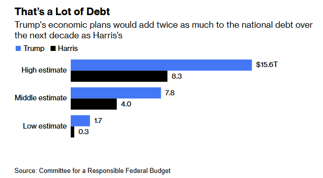 At issue is the likely debt profile of the two parties, with the Committee for a Responsible Federal Budget estimating that a Trump administration would increase the overall US debt by roughly double what a Harris administration would achieve.