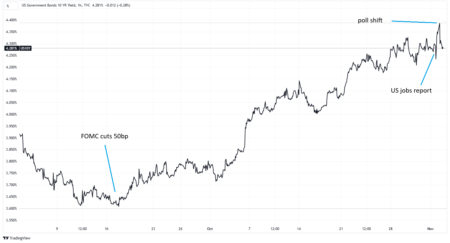 On the one hand, bond yields are projecting well beyond this week. They took one look at the outsized US rate cut in September and started climbing, essentially saying that politics was likely to bring inflation back and getting so far ahead in rate cuts was depleting the arsenal that just might be needed. The 10-year yield is betting that the Fed will not be able to cut rates as much as was initially hoped, and that overall macro uncertainty deserves a higher risk premium. Even the bad US jobs report on Friday (more on this below) produced only a brief hiccup.