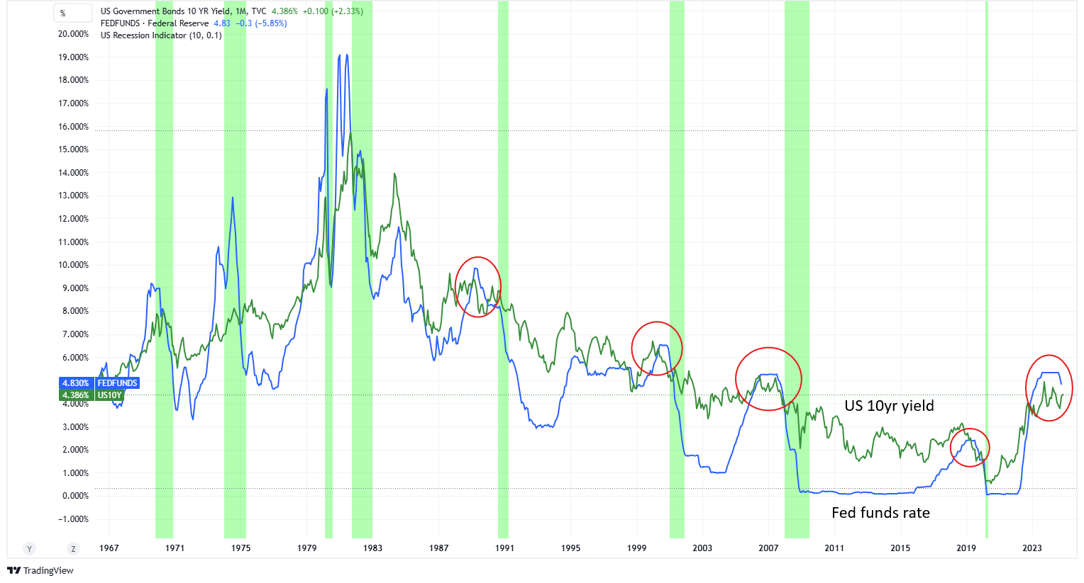 Now, a fed funds cut with climbing yields sounds unnatural – surely something will snap? Not necessarily.