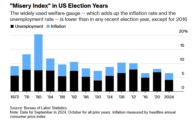 And the dramatically named “misery index”, which adds together inflation and unemployment, is lower than in any other election year going back to the 1970s, with the exception of 2016.