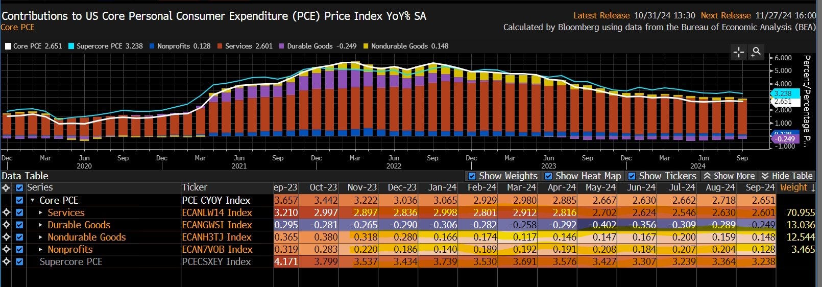 Moving on to inflation, there are signs of stickiness. The latest Personal Consumption Expenditure release for September, released last Thursday, showed an acceleration in month-on-month growth in the headline index, from 0.1% to 0.2%. The more significant core index growth accelerated from 0.2% to 0.3%, the highest rate since April, keeping the year-on-year growth flat at 2.7%.