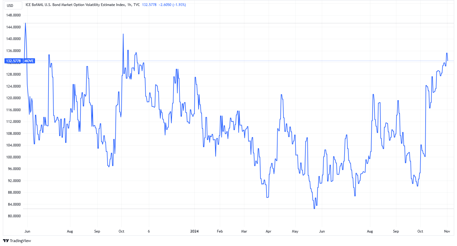 (chart of the MOVE treasury volatility index via TradingView)