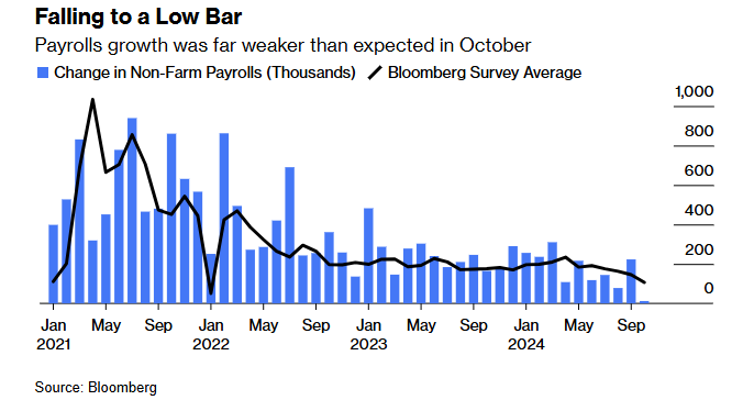 According to the Bureau of Labor Statistics, the number of US jobs increased by a paltry 12,000 in October, much less than average expectations and the lowest level since 2020, although some economists had been warning that we could see a negative print.