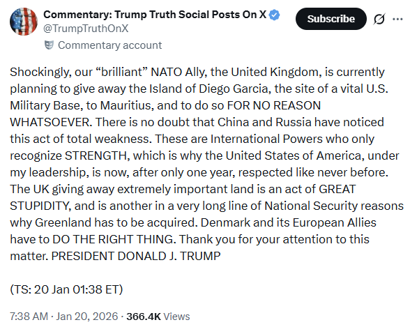 Trump seems to have just noticed that the UK is handing back the Chagos Islands to Mauritius and is apparently livid. The archipelago is in the middle of the Indian Ocean (you’ll need a magnifying glass to find them on the map) and home to the strategically significant Diego Garcia US military base. This, he says amidst a liberal sprinkling of all-caps, is another reason why Greenland has to be acquired.