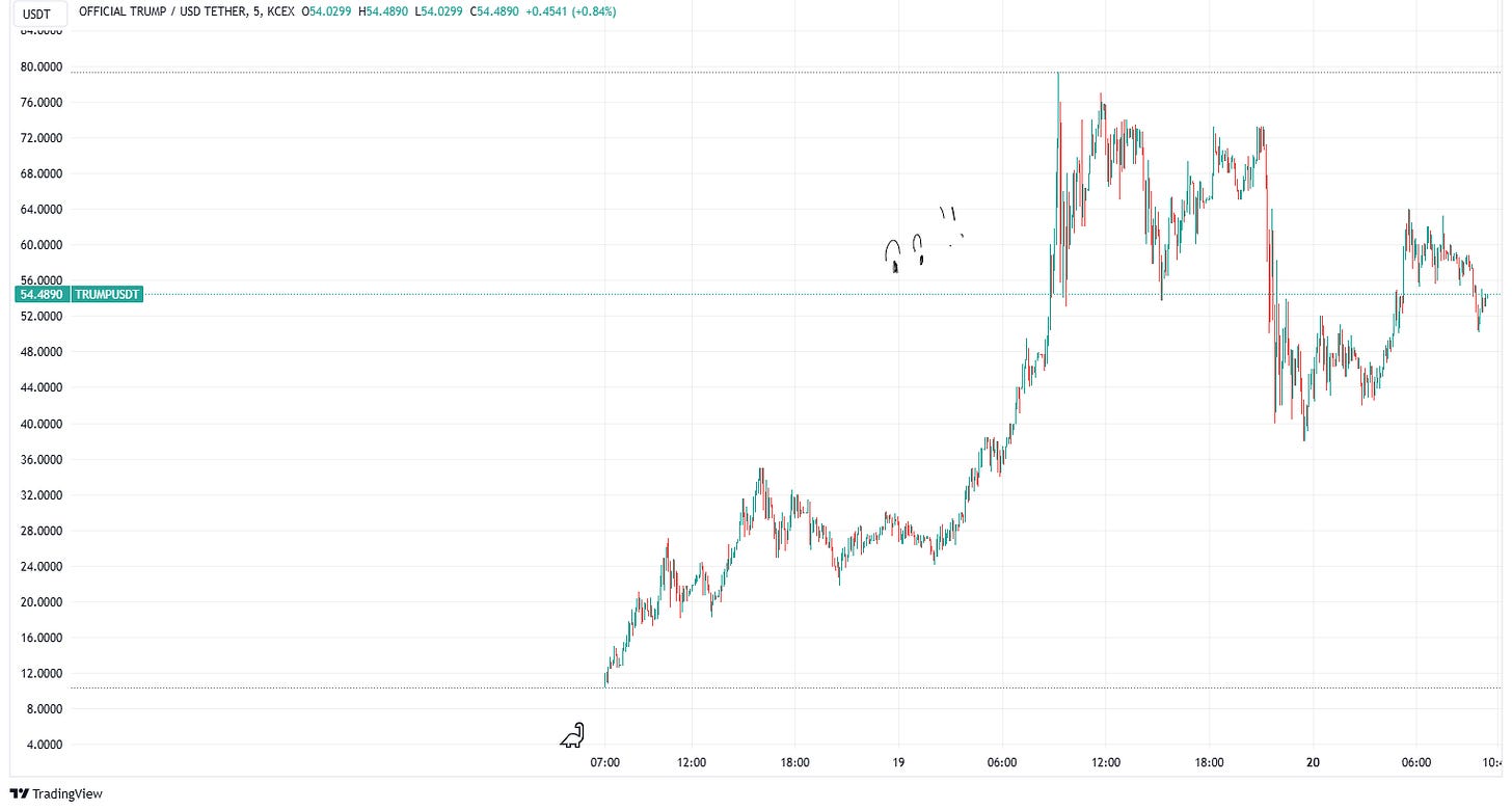 Just when we were starting to agree that nothing could top this in craziness, Melania Trump launched her memecoin $MELANIA, triggering a sharp drop in $TRUMP value. I haven’t heard of a $BARRON coin yet, but by the time you read this, who knows.