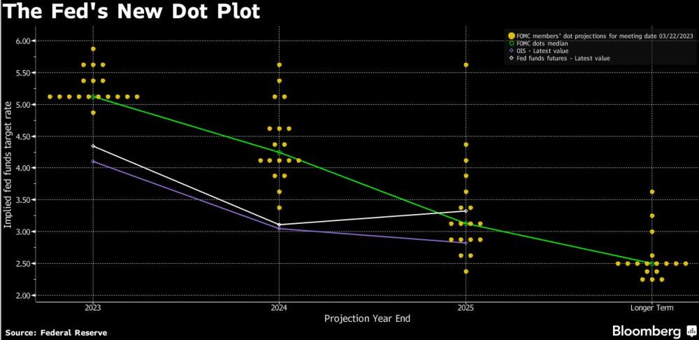 To recap, the FOMC meeting delivered another 25bp hike, the second in a row and the ninth upward move since the current tightening cycle began a year ago. This was the consensus market expectation, so no big deal there, but there were some surprises in the dot plot, the language regarding future hikes, and in what initially seemed like a conflicting message from the Treasury department on bank insurance.