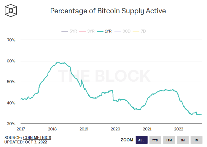 (this chart via The Block Research shows the % of BTC that has moved in the past year)