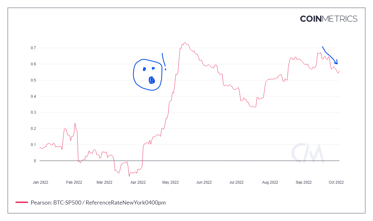 Both are true. The summer climb in BTC-S&P correlation was not necessarily due to macro investors treating crypto as a risk asset – many had already divested, and while speculative trading will always be a feature of crypto markets, the strong flows of funds either in or out have been largely absent.