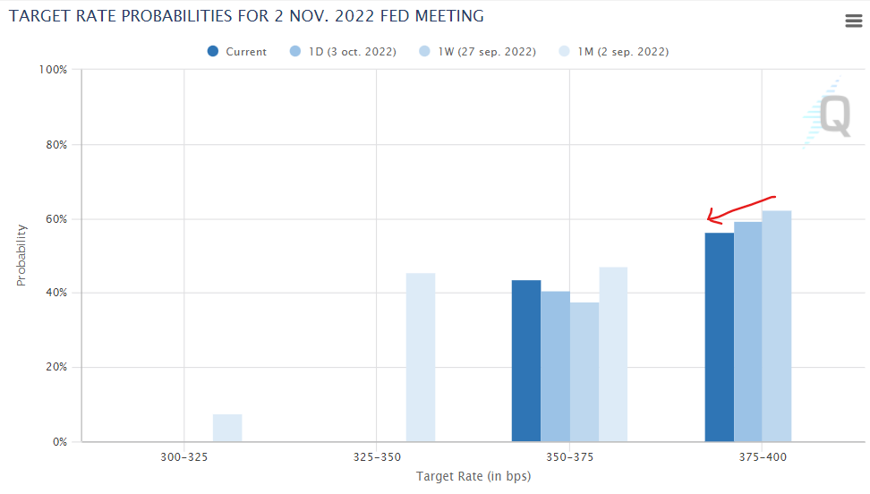 All in all, the data delivered strong signs of a weakening economy, which the market seems to have taken as confirmation that the end of rate hikes is near. The impending slowdown has shifted the market-priced probability of a 75bp hike in November down to 56%.