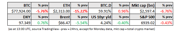 Hello everyone! I hope you all managed to avoid looking at price charts this weekend, ‘cos ouch… And to think just over a week ago I was commenting on how weirdly quiet BTC was outside traditional market trading hours.