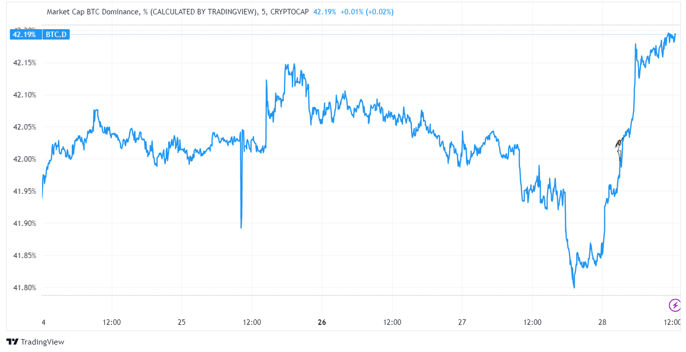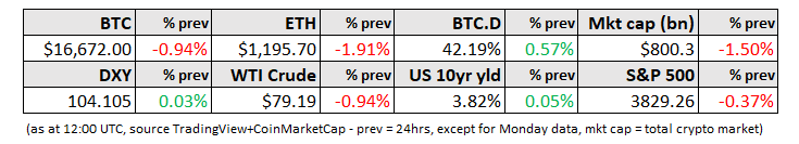 BTC was more or less flat over the holiday break, until yesterday’s jump in bond yields (the US 10-year yield reached its highest point since mid-November) triggered another bout of risk-off selling, dragging BTC down to mid-December levels. Other tokens, including ETH, fared worse, pushing bitcoin’s dominance back above 42.2% - apart from a brief blip in mid-December, this is the highest level since early August.