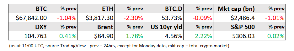 A more compelling reason for BTC’s ennui is yet again the macro environment. US rate cut expectations continue to be pushed back in the light of economic data and Fed official comments, and the US 10-year yield is back up to levels not seen since the beginning of the month.
