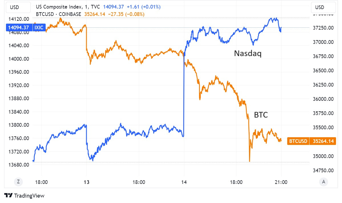 Risk assets celebrated, with the Nasdaq jumping 2.4% yesterday. BTC rose almost 1.5% on the news, but then dropped sharply, down to $36,000. It bounced, but then continued dropping. Bitcoin was not behaving like a risk asset that would benefit from higher liquidity.