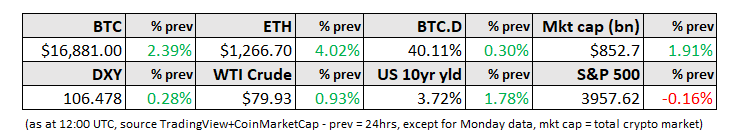 Maybe it’s starting? Yesterday BTC and ETH rallied 2% and 4% respectively (over past 24 hours, at time of writing). This doesn’t yet feel “fundamental”, however, as almost all of that jump occurred in a 10-minute window just after 0:00UTC. In the case of BTC (but not ETH) this was accompanied by a notable spike in volume. Short liquidations were high, but not as much as you would expect from such an abrupt move, so it seems as if this was largely spot-driven.