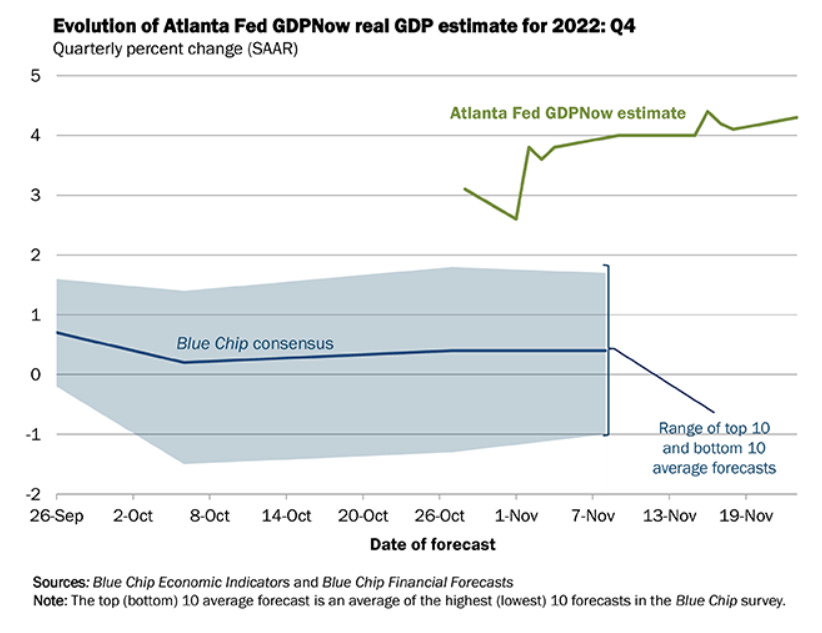 Today we get the happy confluence of a public speech by Fed chair Jerome Powell, and the release of the preliminary US Q3 data. Consensus estimates point to 2.7% growth, a slight increase from last quarter’s 2.6%, and the Atlanta Fed’s GDPNow model (which was much closer to the actual Q2 figures than the consensus) suggests Q4 growth of 4.3%. This will be updated tomorrow and so could change, but so far, it doesn’t look like the US is in a recession.