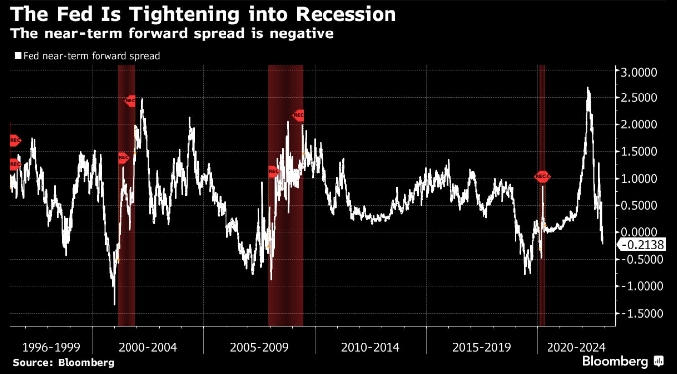 Yield curves are signalling furiously, however. Yesterday we looked at the 10y3m inversion, at its steepest since 1999. Today Bloomberg helpfully shared a chart of the 18m3m spread (I can’t find that on TradingView) – this is the indicator Powell himself said he’d be keeping an eye on for signs of trouble. Back when he said that, the spread was triumphantly positive – now it, too, is negative.