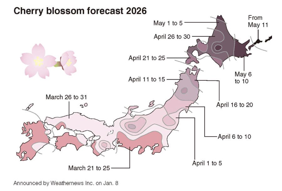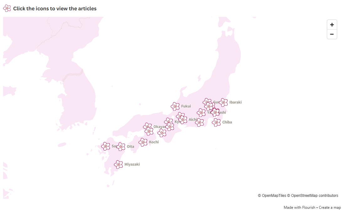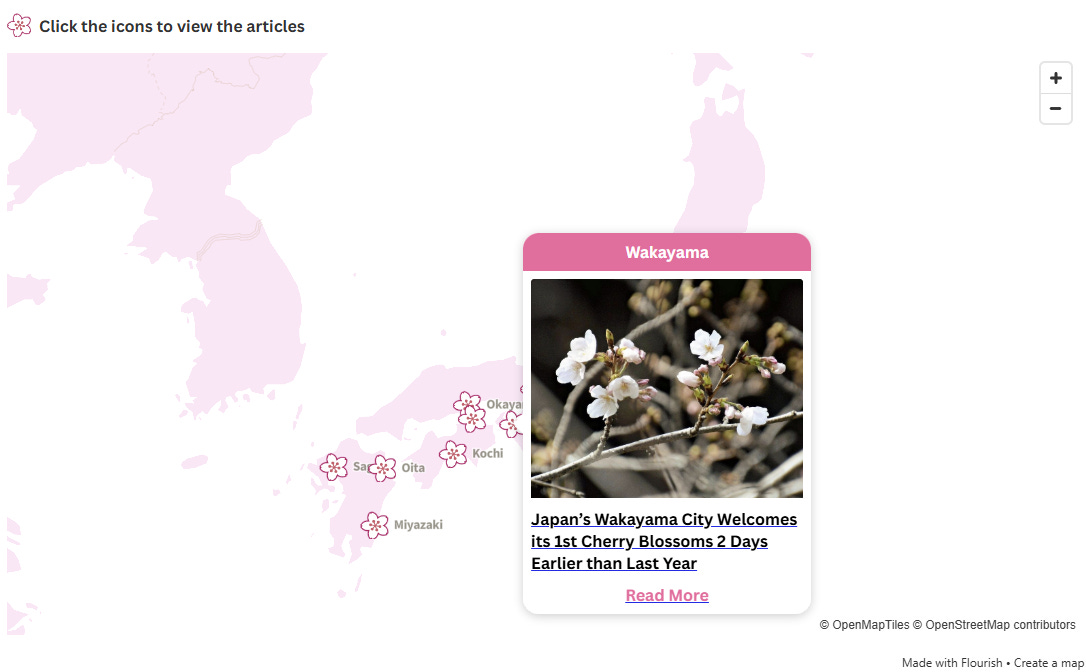 Cherry blossoms are one of the most poignant reminders of how fleeting and yet how soul-restoring pure beauty can be. In a lovely reminder of the value in its appreciation, the Japan News has an interactive map of where Japan’s cherry trees are blossoming right now, with links to articles about the flowering, updated as the season moves north. Refreshing simplicity.