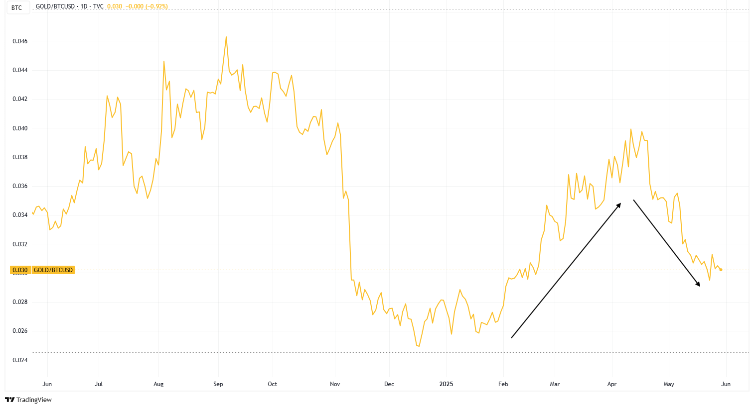 I’m sceptical that the two are as inversely correlated as the chart suggests – it feels like too tidy a narrative, and we know that many gold investors are not interested in BTC and vice versa.