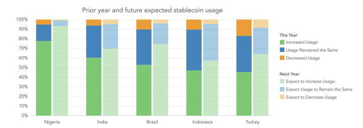 Nigeria has struggled with this, going as far as to blame crypto for the depreciation of the naira. While there’s no doubt more to the country’s currency issues, they’re not wrong to be worried: a survey conducted by YouGov canvassed five major developing economies (Brazil, India, Indonesia, Nigeria, and Türkiye) and found that Nigerians were easily the most familiar with and enthusiastic users of dollar stablecoins.