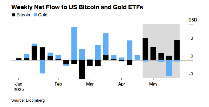 An article on Bloomberg earlier this week shared a chart comparing inflows of BTC spot and gold ETFs. The implication is that investors are rotating out of gold and into Bitcoin.